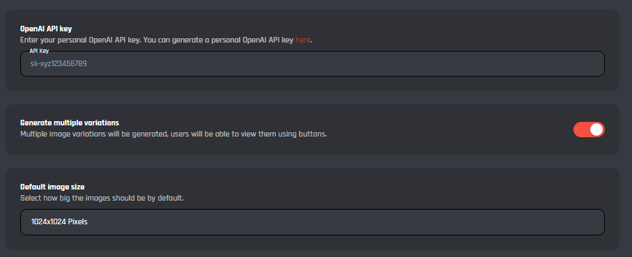 **Generate Multiple Variations:** Here you can enable/disable the option for the bot to generate multiple variations of the image, this will allow you to see multiple versions with one trigger.