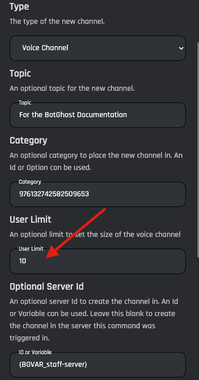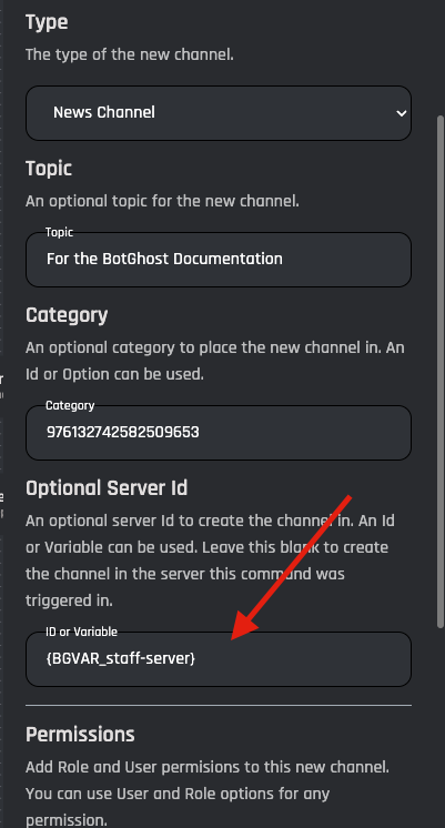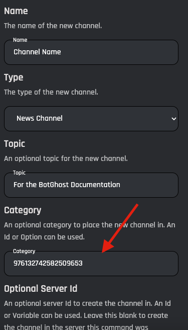 An optional server ID to create the channel in. An ID or Variable can be used. Leave this blank to create the channel in the server this command was triggered in.