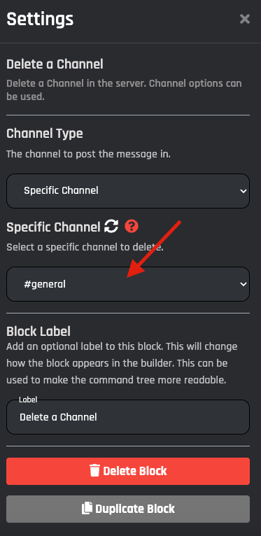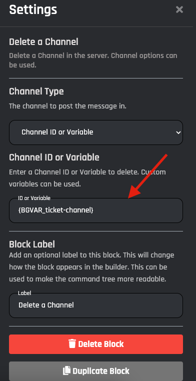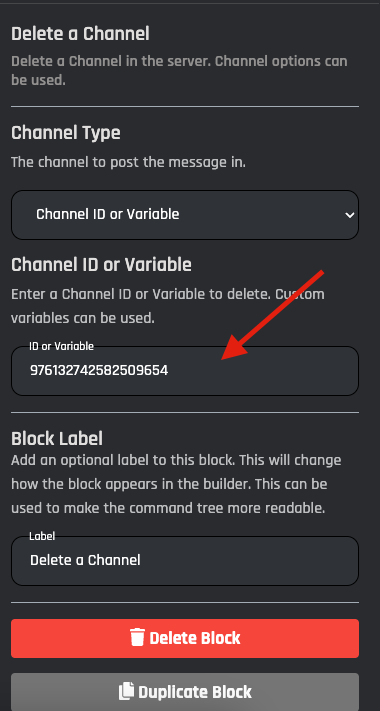 Enter the Variable name of the channel you want to delete. A Channel ID must be stored inside this Variable.
