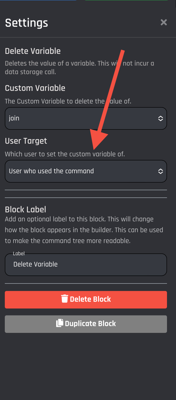 Attaching this block to the Command Tree will delete the value of the variable upon executing the slash command. Want to delete the variable itself? See [data-storage](https://botghost.com/docs/~/changes/zT1fjHAwQ21lXOKdCcfT/data-storage/data-storage "mention").