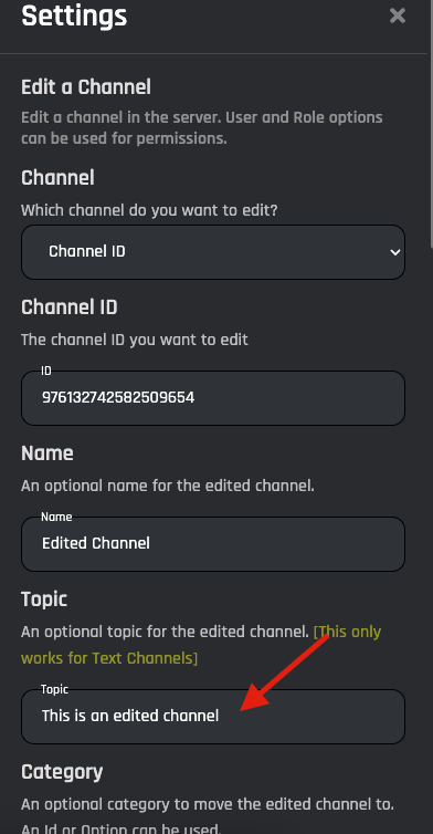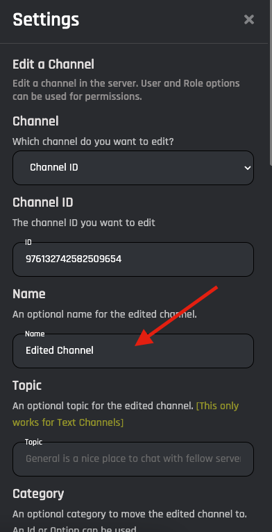 Warning: The bot must have Manage Channels to be able to Edit a channel.