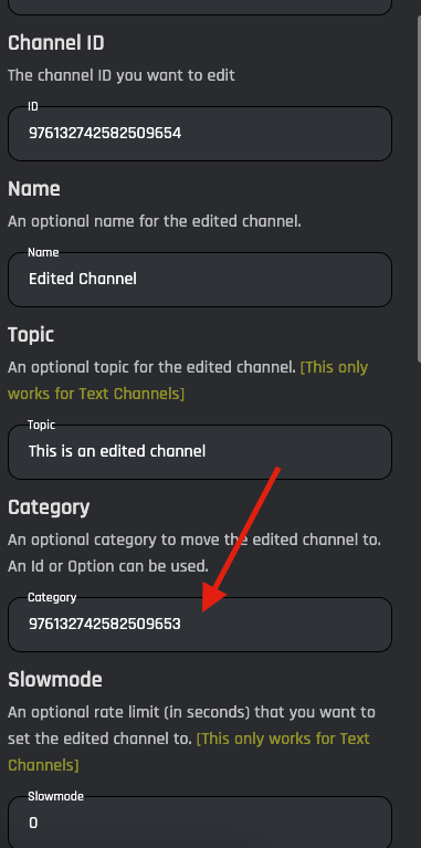 An optional rate limit (in seconds) that you want to set the edited channel too. Don't want to change the Slowmode? Leave this blank.