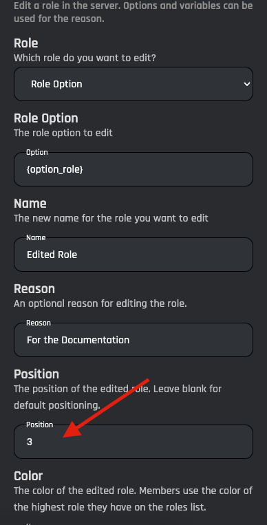 The position of the new role. Leave blank for default positioning. This goes from Down to Top.