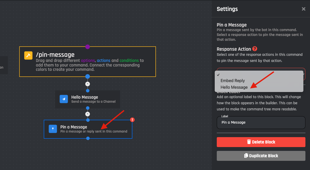 Pin a message sent by the bot in this command. Select a response action to pin the message sent in that action.