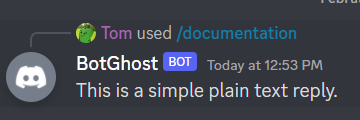 The Plain Text Reply action when triggered responds with a simple plain text message. This message can either reply to a command, be sent to the channel the command was used in, sent to a channel associated with an event, or edit a message sent by another action. All variables and options can be used in the content of the reply.