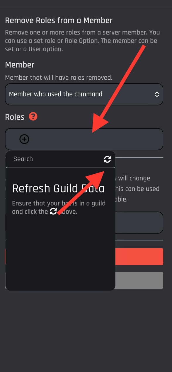 Remove one or more roles from a server member. You can use a set role or Role Option. The member can be set or a User option.