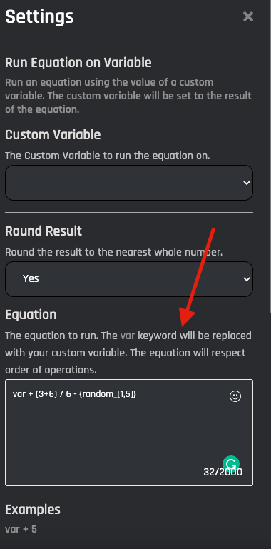 Run an equation using the value of a custom variable. The custom variable will be set to the result of the equation.