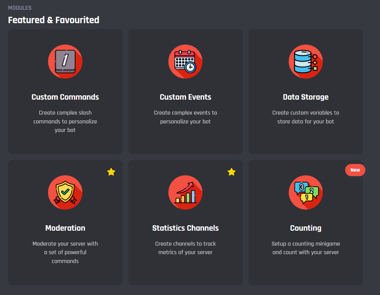 We have created a new module system that allows us to create custom modules without our developers having to hard code them. This system uses inputs that are linked to a variable in combination with custom commands and events to create a module on the dashboard. This allows us to create modules without having to hard code systems from scratch, meaning we can create and update modules more quickly. You are able to completely modify the modules commands and events just like a custom command or event. Do note that these modules commands and events count towards your free limits.\
