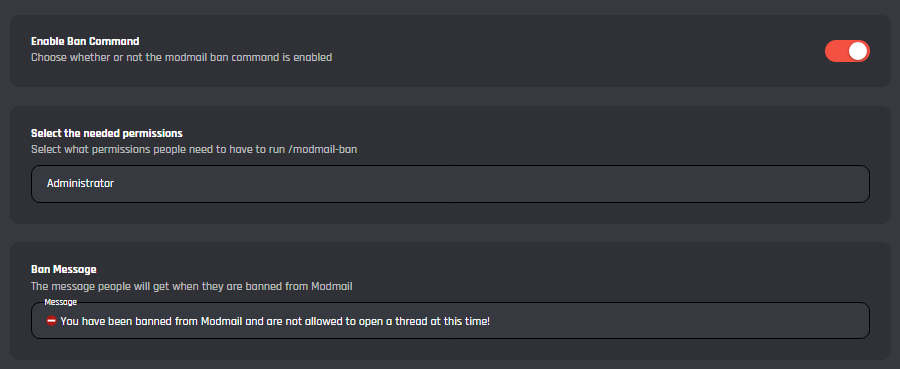 Here you can configure the modmail ban command which restricts users from opening a modmail thread.
